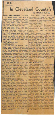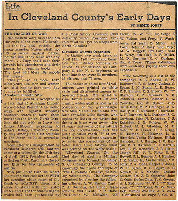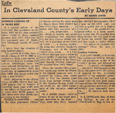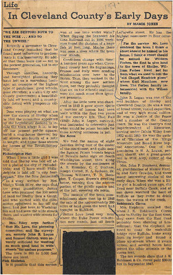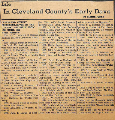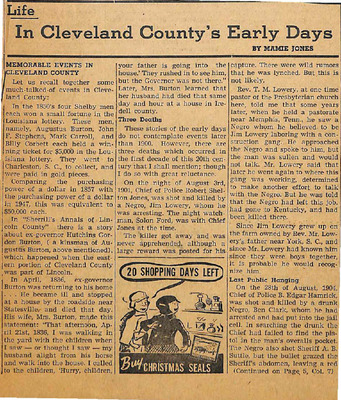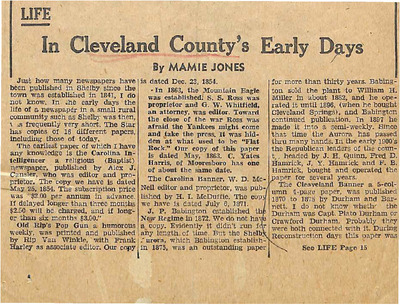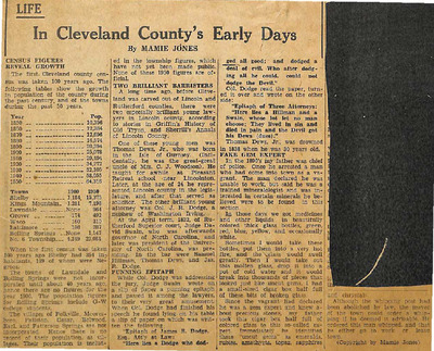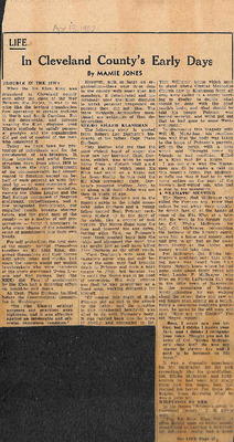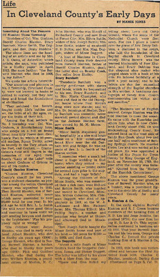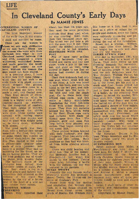 Mamie Jones’s Cleveland County Early Days newspaper column, originally published in The Shelby Star, documents everyday life, cultural practices, transportation, industry, and notable residents of Cleveland County, North Carolina. The column reflects both documented history and memory-based storytelling, featuring personal recollections, oral traditions, biographies, and accounts of community events.
