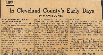 This article highlights notable women of Cleveland County, focusing on figures such as Sallie Homesley, during the Civil War era, and Mrs. Jane Marks, an early educator who helped establish religious instruction and schooling in Shelby. It also profiles musical talents like Lillian Homesley Bott and Minnie Eddins Roberts, along with mothers whose sons achieved literary prominence, including those connected to authors Thomas Dixon Jr., Wilbur J. Cash, and Hatcher Hughes.
