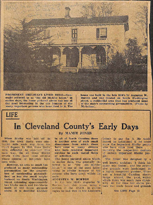 This article explores the history of prominent residents along South Washington Street in Shelby, particularly the house originally built in the late 1850s by Augustus W. Burton, often called the “old McAfee house.” It traces the succession of notable occupants—including the Roark, McAfee, Anthony, Webb, and Gardner families—and highlights their political, religious, educational, and civic contributions to North Carolina. The home was later locally known as “Webbley” or the O. Max Gardner House. The article also connects nearby homes and residents, such as the Dixon and Durham families.