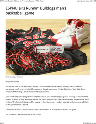 For the first time in Gardner-Webb history, ESPNU will televise the Runnin’ Bulldogs men’s basketball team tonight, at 7 p.m. in the Paul Porter Arena. “People you see on ESPN will be there,” said Katie Spiro, Director of Marketing & Promotions for Athletics at GWU.