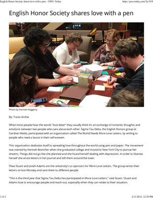 When most people hear the words “love letter” they usually think it’s an exchange of romantic thoughts and emotions between two people who care about each other. Sigma Tau Delta, the English Honors group at Gardner-Webb, participated with an organization called The World Needs More Love Letters, by writing to people who need a boost in their self-esteem.