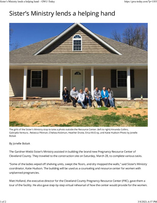The Gardner-Webb Sister’s Ministry assisted in building the brand new Pregnancy Resource Center of Cleveland County. They traveled to the construction site on Saturday, March 28, to complete various tasks.